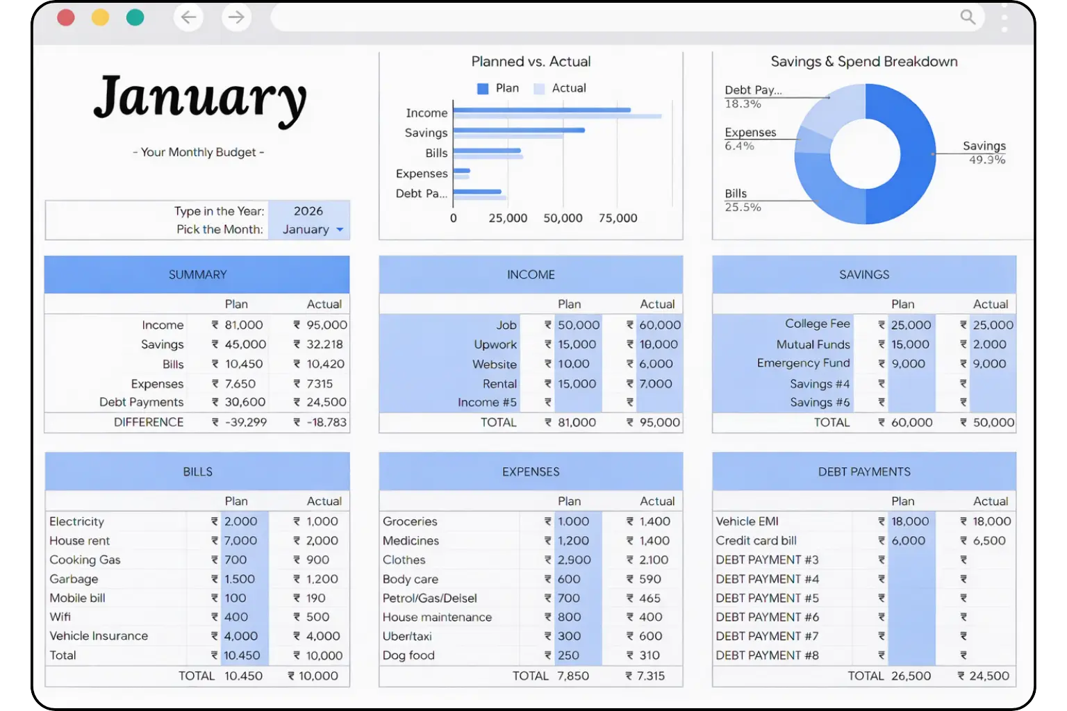 Get a full breakdown of your planned vs. actual spending, savings, income, bills, expenditures, and debt payments. This overview helps you understand your financial status at a glance.