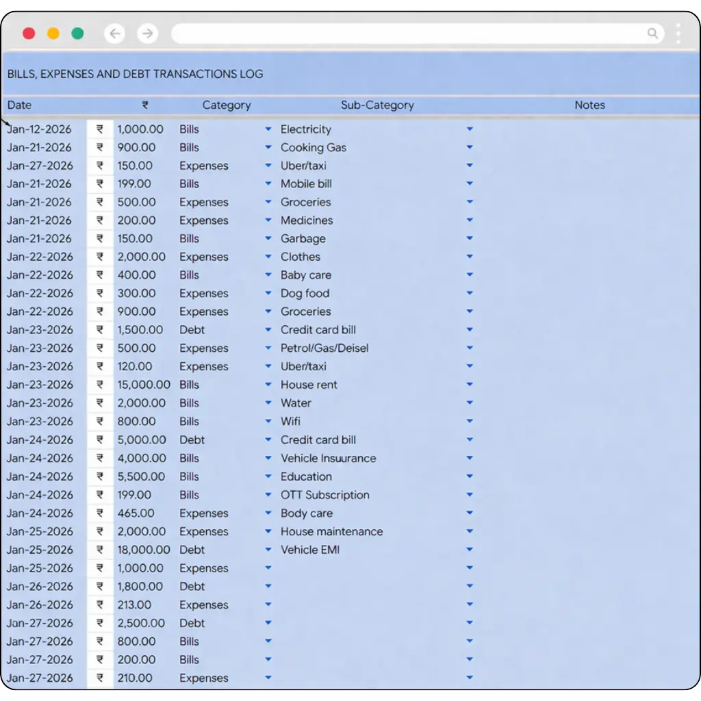Use the Log Tab to record your actual bills, expenses, and debt transactions as you spend money. Enter the date, value, category, and sub-category of each transaction, and the spreadsheet will automatically update the main dashboard.